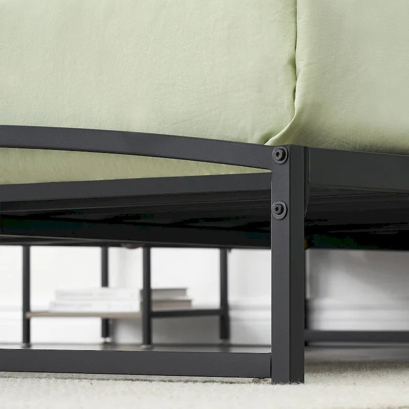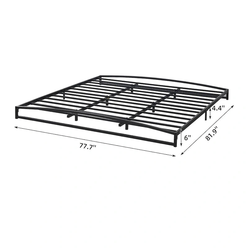 This platform bed features heavy-duty steel construction with a metal slat for stability, It's built from steel in a solid neutral finish. The slatted head strikes an arched silhouette and features classic ironwork-style accents. With plenty of clearance underneath, it's ideal for keeping storage boxes out of sight. This bed has center legs that provide additional stability. Best of all, no box spring is necessary. 6 Low profile modern design allows you to easily get in and out of the bed or to add an extra profile with the mattress thickness that you prefer. Elevates your bedroom with a clean, classic look.