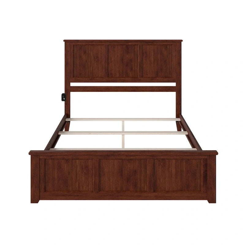 Transform Your Bedroom into a Haven of Comfort with the Madison Solid Wood Foundation Bed Frame with Matching Footboard. Its timeless design, characterized by clean lines, exudes enduring elegance that can be cherished for generations. The Madison Foundation Bed not only offers enduring style but also remarkable versatility. This Bed requires a foundation or box spring to be mattress ready. Choose from a selection of finishes, including espresso, white, walnut, light toffee, and grey, and select the ideal size to suit your space whether it's twin XL, twin, full, queen, or king. Furthermore, with the included surface mount turbo charger, you can ensure all your electronics stay charged and ready for action! Elevate your bedroom with the Madison Solid Wood Foundation Bed Frame with Matching Footboard Where Comfort Meets Timeless Style.