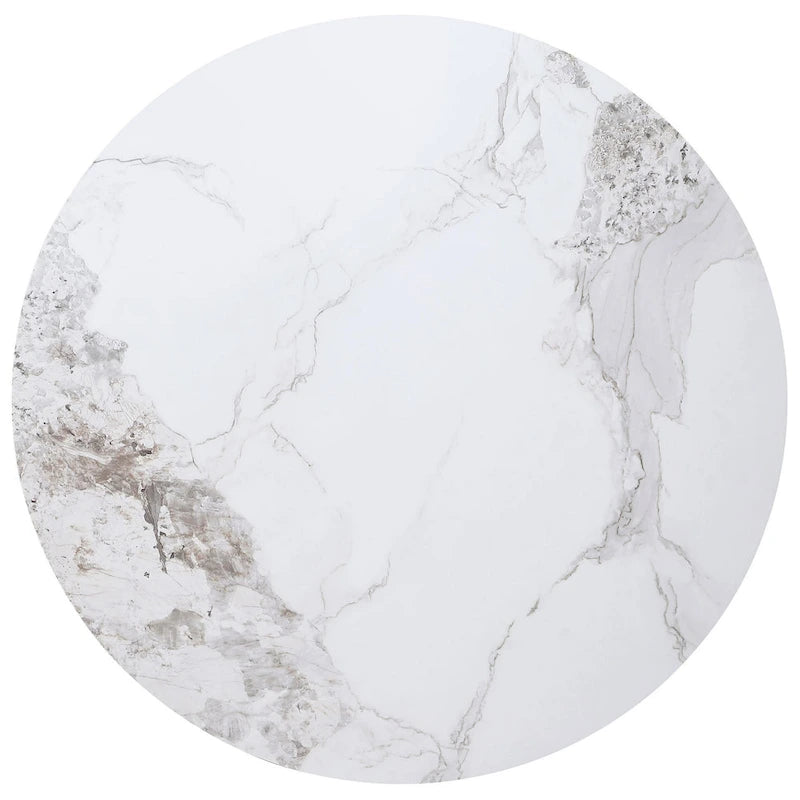 Elevate your dining experience with this round dining table. The smooth surface is enhanced with subtle gray veining, adding depth and sophistication. The round top sits on a sturdy pedestal base, completed by vertical reeded details for texture. The white marble-like sintered stone is non-porous and stain-resistant, ensuring lasting durability and easy care. Explore our Cade collection for more.