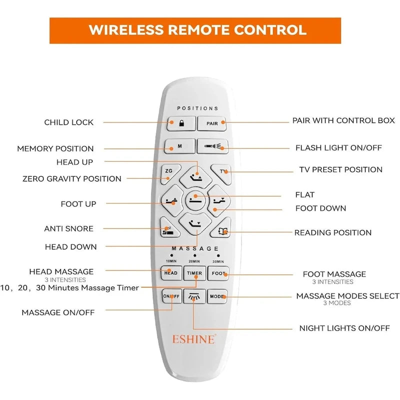 Wireless Remote Control & Easy to Install:Wireless remote in this adjustable smart bed having 19 buttons can meet all functional needs, such as watching TV position, massage, and anti-snore sleep. Easy Installation will be in 10 minutes and no tools are required.