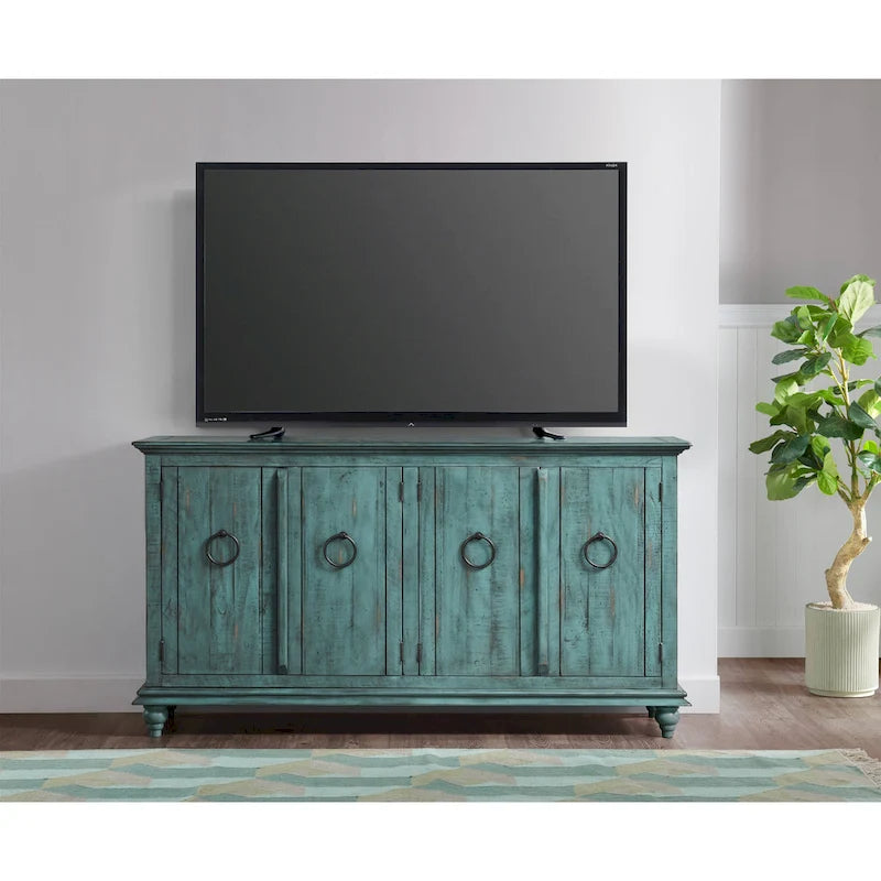 Bring a touch of French Quarter charm to your home with the Garden District Solid Wood 65 TV Stand. This TV stand features architectural moldings, ring pulls, and turned bun feet that add to its traditional rustic style. The solid pine wood construction is built to last, and each piece is uniquely distressed with rub through on the finish, antiquing, nail head or pin holes, rough-sawn marks, and rasping, making it truly one-of-a-kind. This versatile piece is available in multiple finishes, and can be used as a TV stand, entryway credenza, accent cabinet or dining room server. The cabinet contains two adjustable shelves for ample storage and cable management cutouts are included.