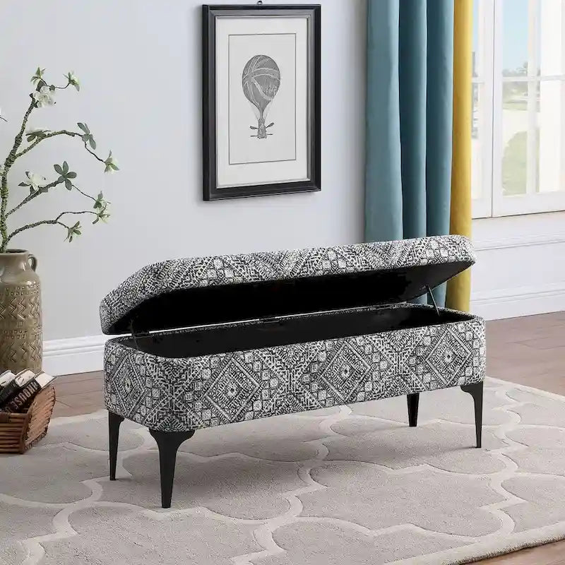 Add style and storage to any room in your home with our HomePop Large Modern Storage Bench. Featuring a modern glamorous design and matte black metal legs, our multi-functional sustainable tribal print storage bench can provide seating and double as a coffee table, a bedroom bench or as an entryway bench with storage. This unique and functional bench easily blends with many different styles and colors in your home. Easy to assemble and maintain, spot clean only.