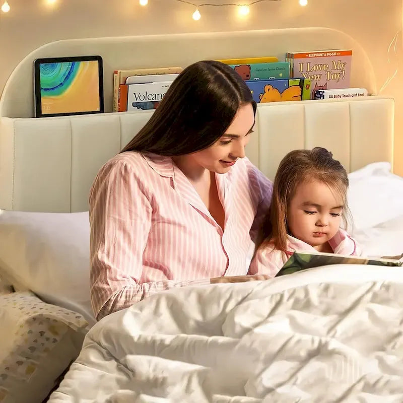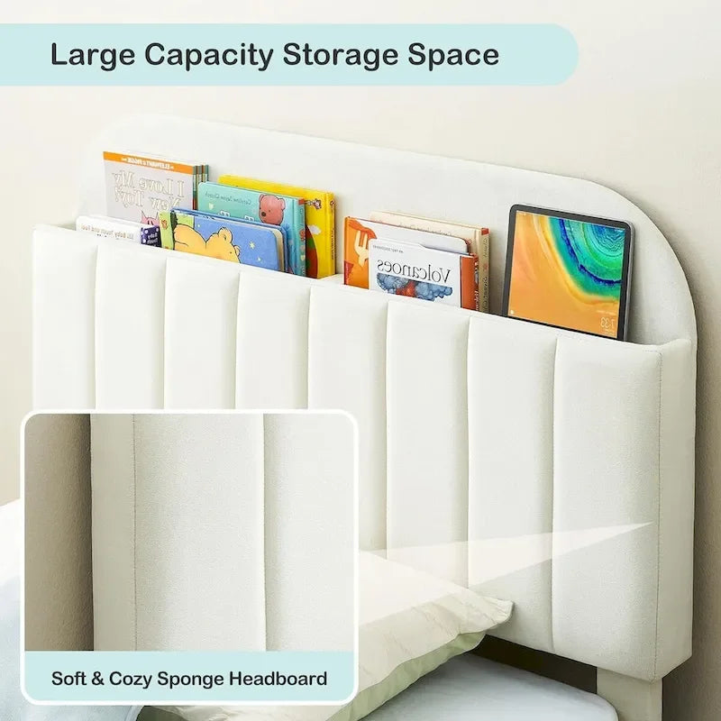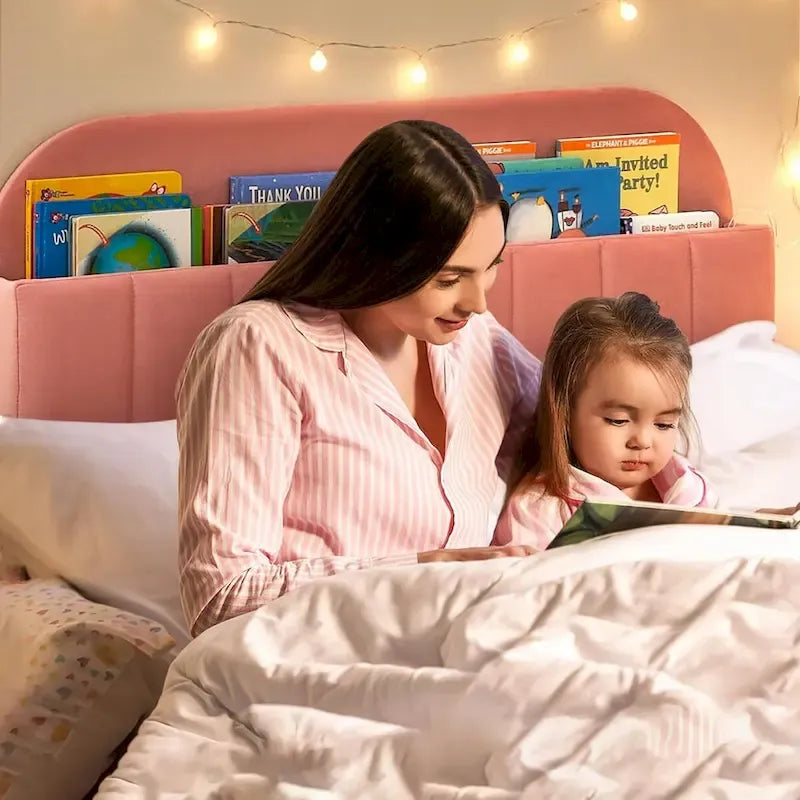 - Upholstered Headboard with Bookcase: Soft velvet upholstered headboard with 2 open storage bookcase to store the books or toys. This velvet twin upholsted bed frame offers lasting comfort and support for kids, creating a cozy space for sitting and reading while promoting organization and enhancing their reading skills.