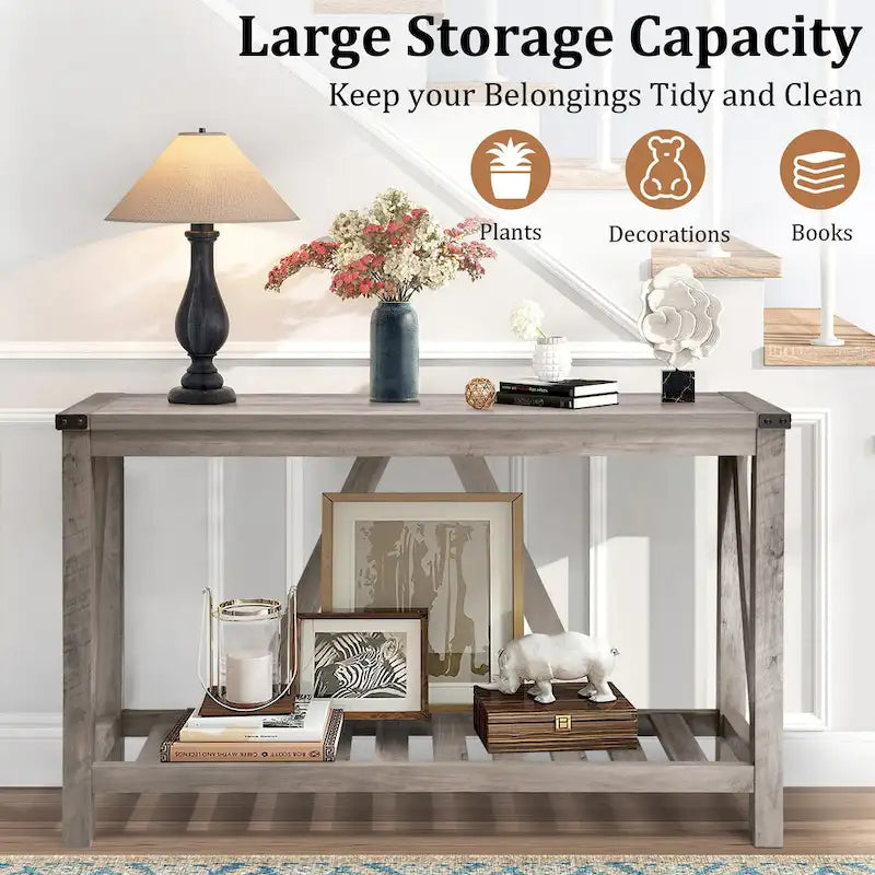 Whether placed behind a sofa or up against a wall, add the finishing touches to your living spaces with this VredHom console table. The combination of open storage and a large top creates plenty of space for displaying a variety of items. Use it as an entryway table, hallway table to add some warmth and character to your living room.